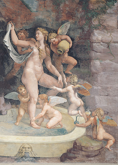 Итальянская фреска с сюжетом в стиле ренессанс AM051 произведена из натурального материала (кварцевой крошки) на плотной флизелиновой основе. Все фрески коллекции Palladio по своим размерам и цветовому решению изображения соответствуют историческим прототипам. Благодаря высокому качеству достигается достоверность имитации настоящей фресковой росписи.